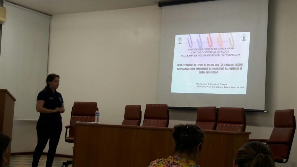 A mestranda Graziele defendeu o projeto intitulado “Custo-efetividade da espuma de poliuretano com borda de silicone comparada ao filme de poliuretano na prevenção de úlcera por pressão”.