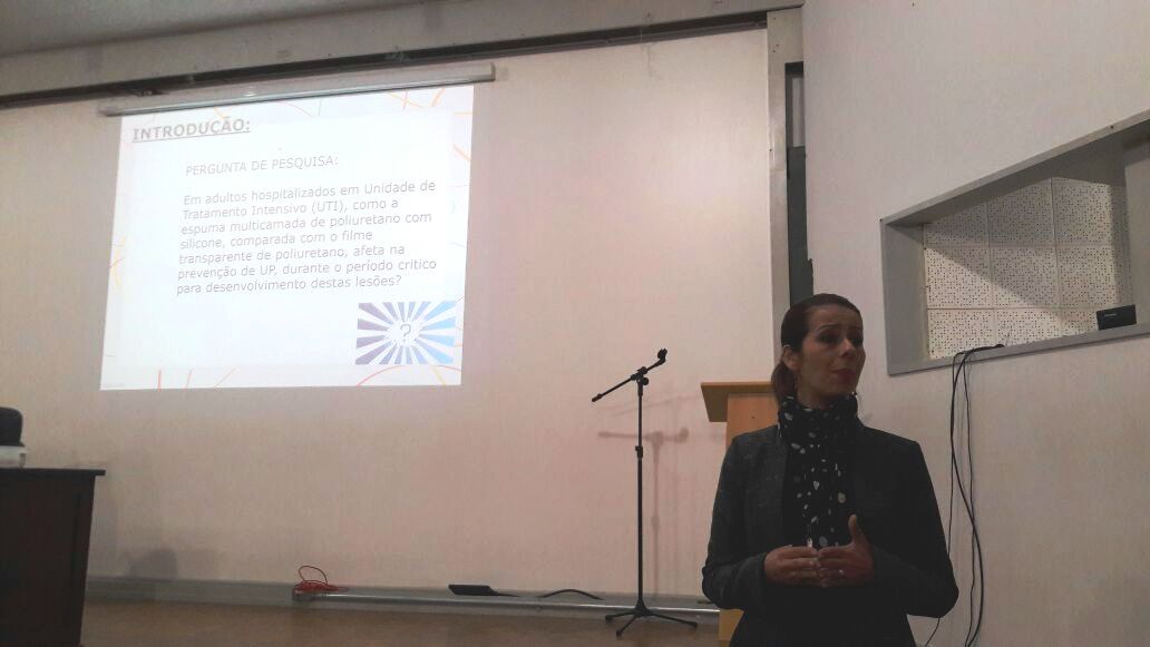 Durante sua participação, a doutoranda apresentou seu projeto de tese “Ensaio clínico randomizado sobre a efetividade da espuma multicamadas de poliuretano com silicone comparada ao filme transparente de poliuretano na prevenção de úlcera por pressão”. Além de apresentar os resultados parciais de um mês de coleta de dados na unidade e agradecer a participação, apoio e receptividade da equipe da UTI.