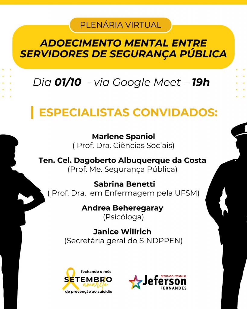No dia 1º de outubro de 2025, a egressa do PPGENF/UFSM, Dra. Sabrina Benetti, participou da plenária virtual “Adoecimento mental entre servidores da Segurança Pública” na Assembleia Legislativa do Rio Grande do Sul a convite do Deputado Jeferson Fernandes. O encontro reuniu representantes da Polícia Penal, Polícia Civil, Brigada Militar e Polícia Rodoviária Federal, além de profissionais e pesquisadores da área. Sabrina apresentou os resultados de sua pesquisa de doutorado sobre “Carga mental do trabalho e estresse ocupacional em trabalhadores do sistema prisional“, orientado pela Profa Dra. Rafaela Andolhe. Na oportunidade, destacou os fatores que contribuem para o adoecimento psíquico e a importância de políticas institucionais voltadas ao cuidado com a saúde mental desses profissionais. A plenária proporcionou um espaço de diálogo e reflexão sobre os desafios enfrentados pelos servidores da segurança pública e a necessidade de ações integradas de prevenção e promoção da saúde.
