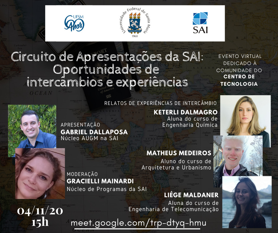 A Secretaria de Apoio Internacional está promovendo uma série de eventos virtuais com o objetivo de apresentar os serviços prestados pela SAI e fomentar o entendimento e a cultura da internacionalização dentro da UFSM. A SAI convida a toda a comunidade acadêmica do Centro de Tecnologia, para que, no dia 04/11 (quarta-feira) às 15h, participem do “Circuito de Apresentações da SAI: Oportunidades de intercâmbio e experiências”.