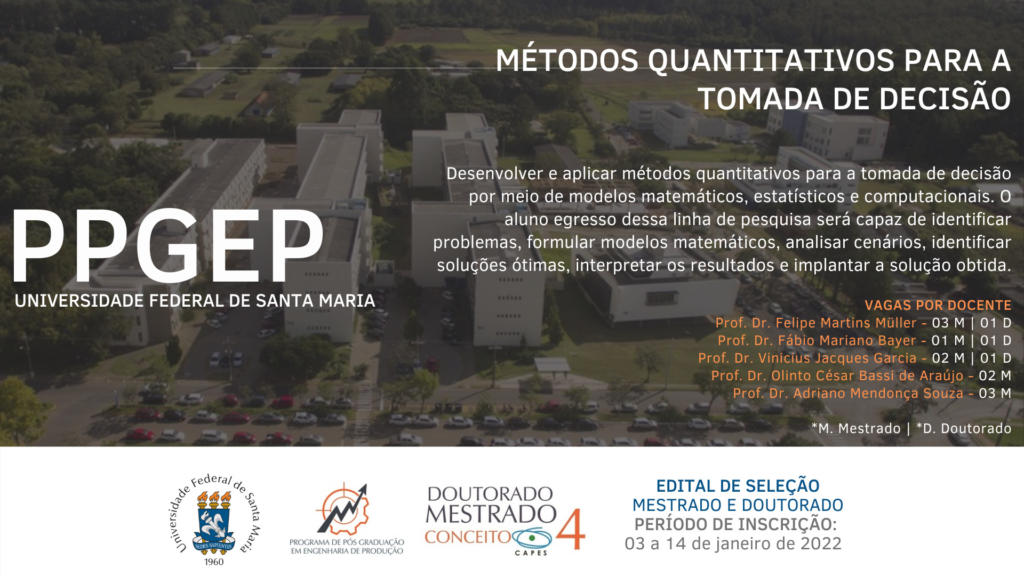 A comissão de seleção divulga o quantitativo de vagas na linha de pesquisa Métodos Quantitativos para a Tomada de Decisão para o próximo edital de seleção do PPGEP.