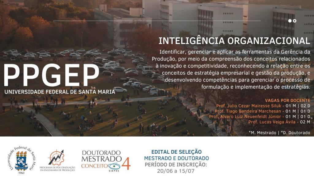 A comissão de seleção divulga o quantitativo de vagas na linha de pesquisa Inteligência Organizacional para o próximo edital de seleção do PPGEP.