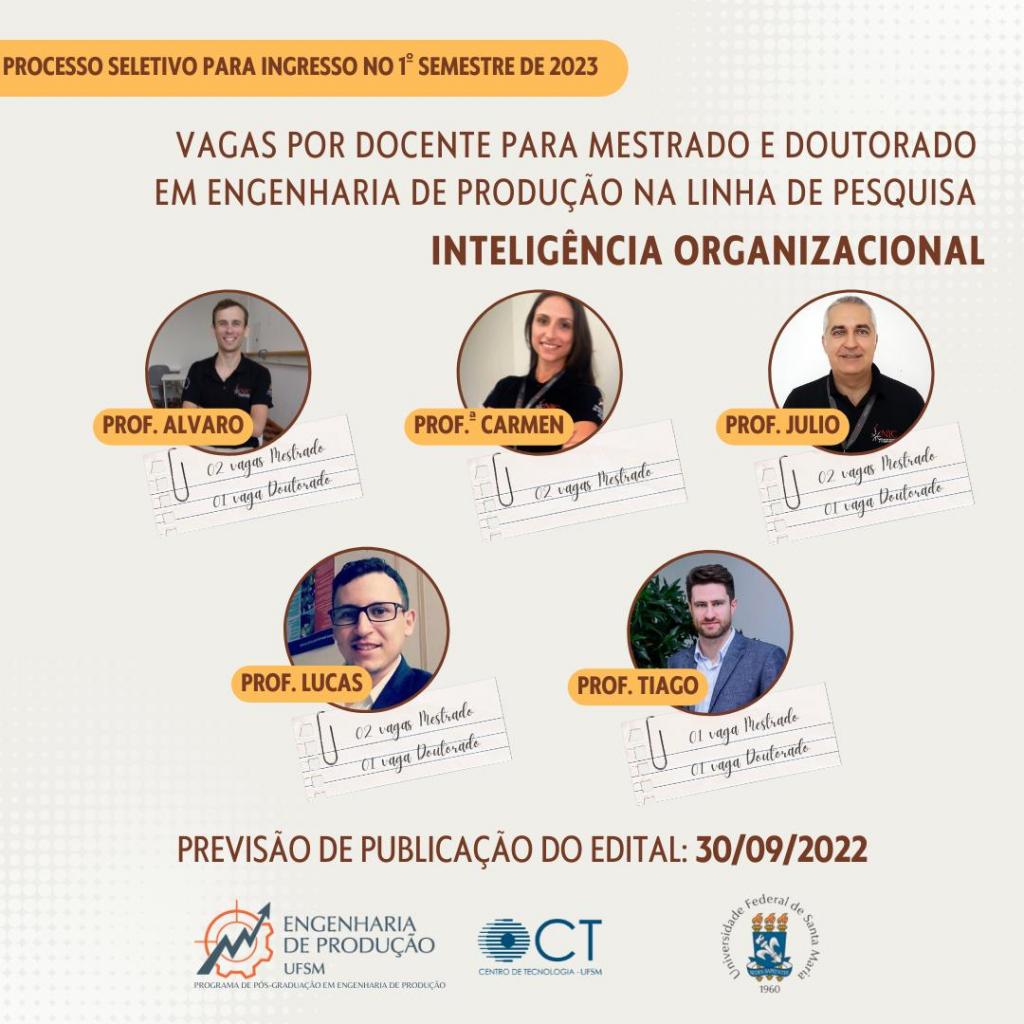 Processo seletivo para ingresso no 1º semestre de 2023, vagas na linha de pesquisa Inteligência Organizacional