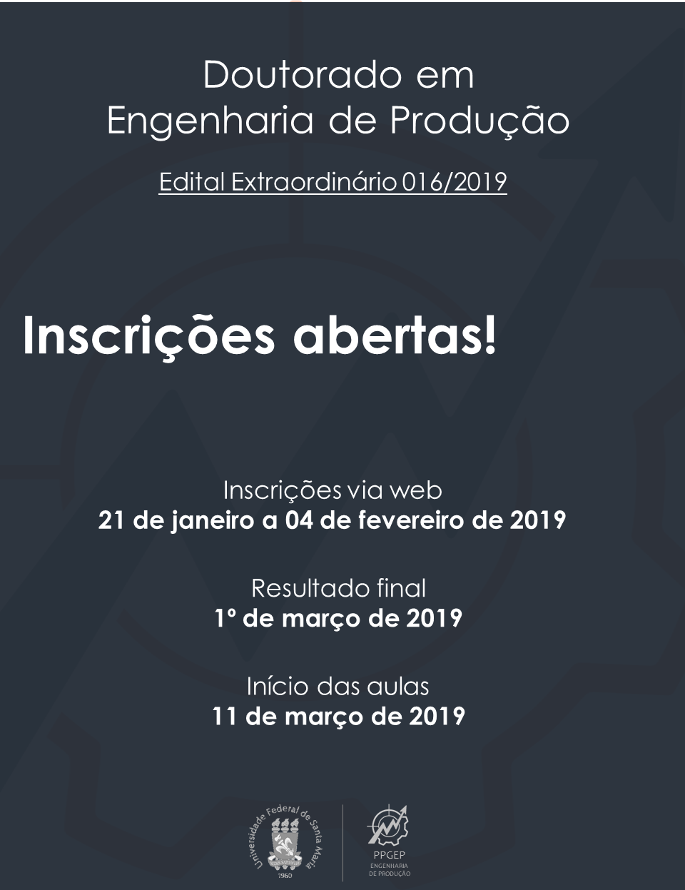 Abertas as inscrições (até 04/02) para Doutorado em Engenharia de Produção/UFSM para ingresso no 1º semestre de 2019A Coordenação do Programa de Pós-Graduação em Engenharia de Produção e a Pró-Reitoria de Pós-Graduação e Pesquisa (PRPGP) tornam público que, no [...]