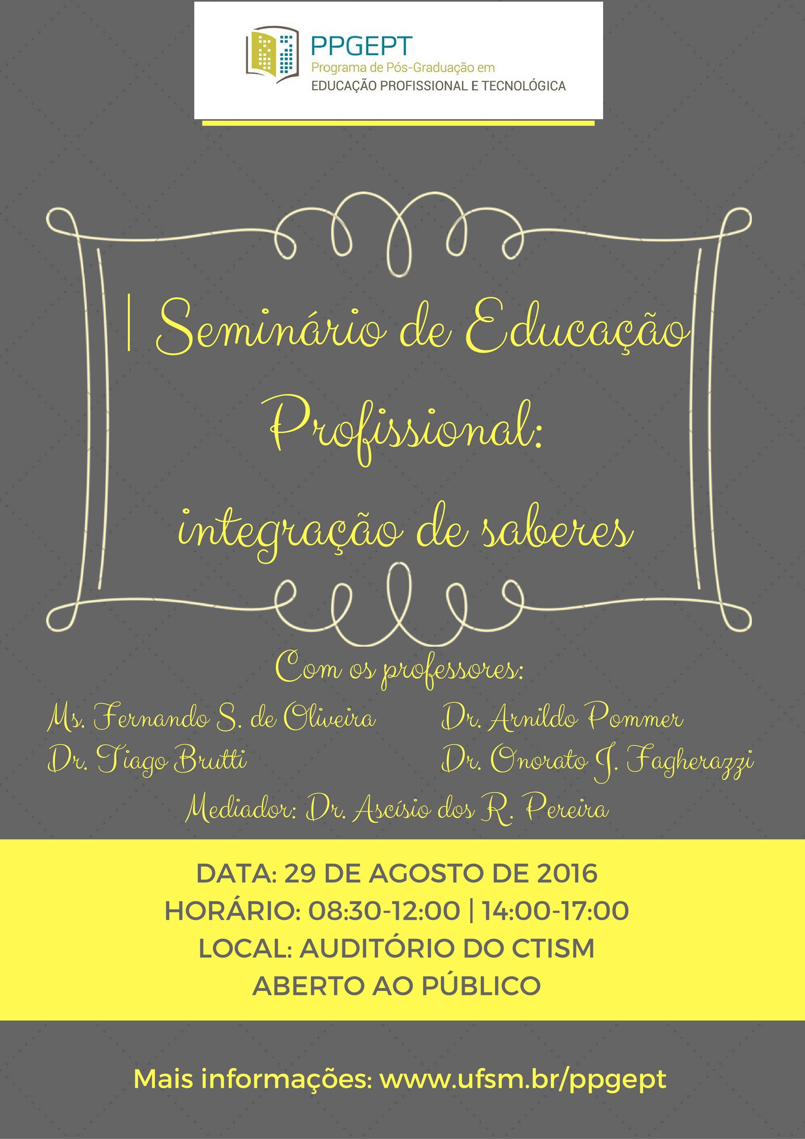 Dia 29 de agosto, segunda-feira, será realizado o I Seminário de Educação Profissional: integração de saberes. As atividades ocorrerão nos turnos da manhã e tarde e serão abertas ao público acadêmico. Para conferir a programação completa, clique aqui.