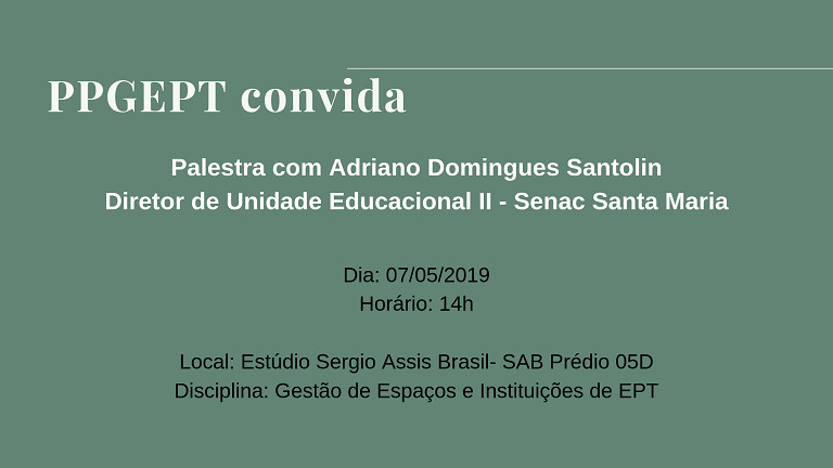 O Programa de Pós-Graduação em Educação Profissional e Tecnológica, através da disciplina Gestão de Espaços e Instituições de EPT, convida gestores de intuições de ensinos públicas e privadas para compartilhar as suas experiências em gestão.