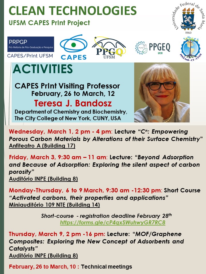 Entre os dias 27/02 e 10/03 a pesquisadora Teresa Bandosz, professora do Chemistry and Chemical Engineering do City College of New York (Ph.D. In Chemical Engineering (Krakow Polytechnic); D.Sci. in Physical Chemistry (Maria Curie-Sklodowska University) realizará a Missão de Trabalho através do Programa Capes Print. Essas atividades envolvem os programas de pós graduação PPGEQ, PPGQ e PPGEAmb da UFSM. No Brasil, a professora irá proferir palestras relacionadas ao seu tema de pesquisa onde atua na área de preparação de materiais e suas aplicações em questões ambientais relacionadas ao desenvolvimento de adsorventes e processos de separação. Em suas pesquisas recentes estão os temas: síntese de grafeno/FOM, grafeno/compósitos para separação e aplicações em energia, materiais carbonáceos visando foto atividade em luz visível, armazenamento de energia, sequestro e redução de CO2, desenvolvimento de sensores a base de carbono e catalisadores (ORR) para reação de redução de oxigênio.
