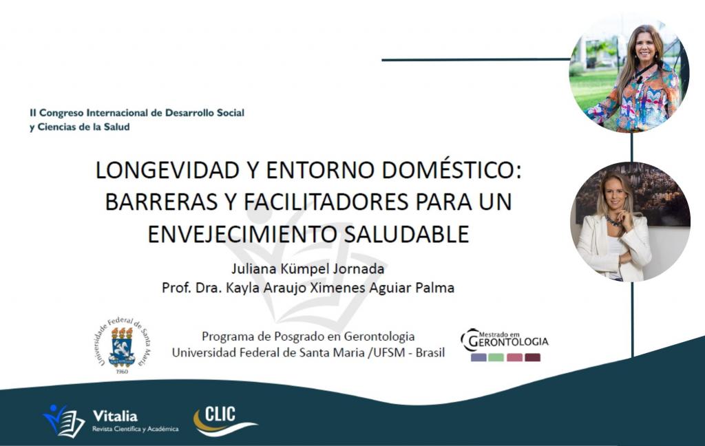 No dia 07 de agosto de 2025, a discente Juliana Jornada participou como representante do Programa de Pós-Graduação em Gerontologia da Universidade Federal de Santa Maria (UFSM) do II Congresso Internacional de Desenvolvimento Social e Ciências da Saúde, promovido pelo Centro CLIC (Centro Latinoamericano de Investigación y Ciencia- Paraguai). O evento, realizado em formato virtual, reuniu pesquisadores de diversos países da América Latina em um espaço de diálogo interdisciplinar sobre os desafios e perspectivas nas áreas da saúde e desenvolvimento social.