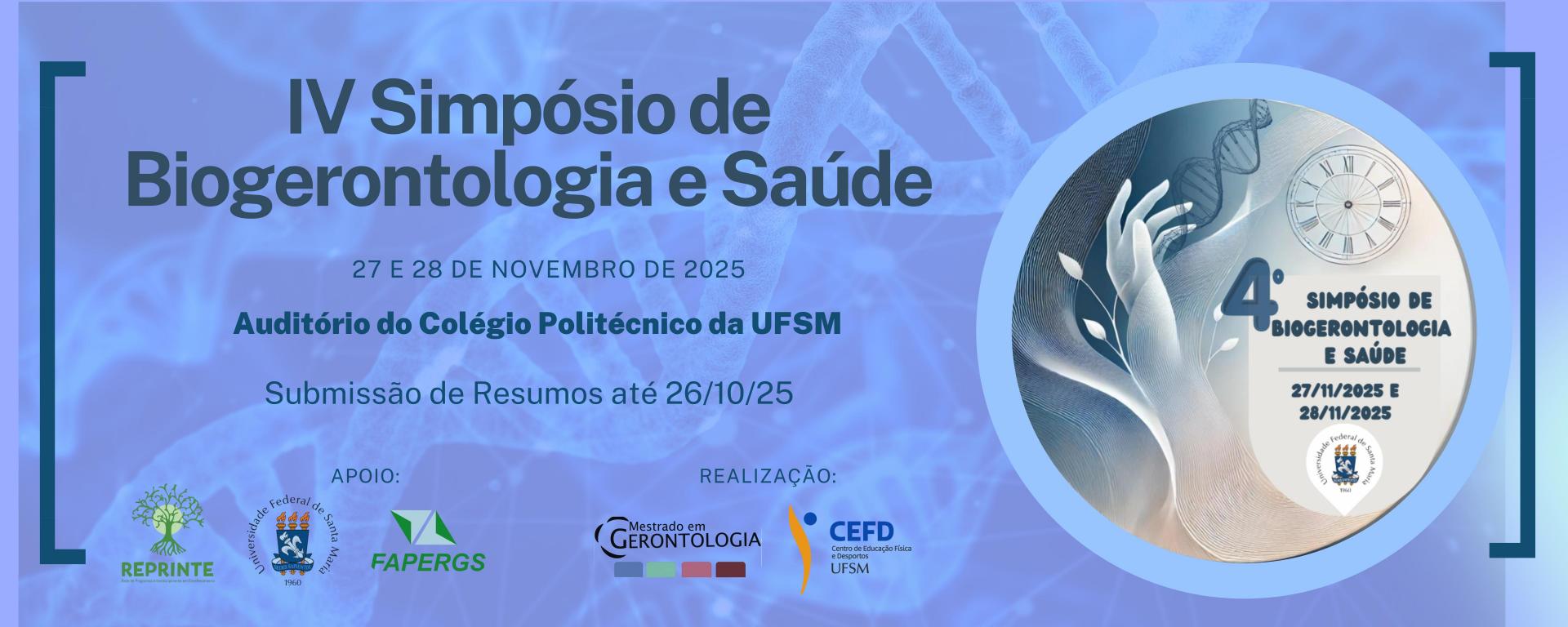 O Programa de Pós-Graduação em Gerontologia da Universidade Federal de Santa Maria (UFSM) convida para o 4º Simpósio de Biogerontologia e Saúde, que será realizado nos dias 27 e 28 de novembro de 2025 no Auditório do Colégio Politécnico da UFSM.