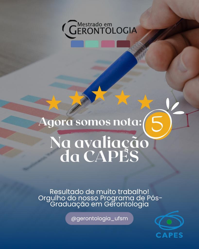 O Programa de Pós-Graduação em Gerontologia da Universidade Federal de Santa Maria (UFSM) alcançou Nota 5 na Avaliação Quadrienal da CAPES, resultado de muito trabalho, compromisso acadêmico e dedicação da coordenação, do corpo docente, dos discentes e de toda a comunidade acadêmica envolvida.