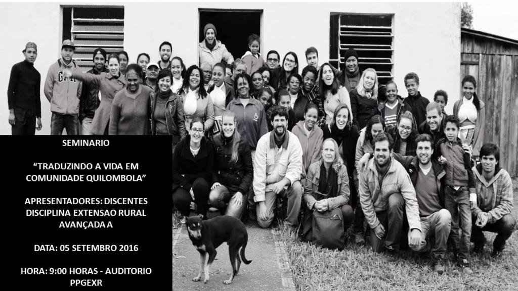 O Programa de Pós-Graduação em Extensão Rural (PPGExR) convida os discentes e docentes interessados à participar da apresentação dos trabalhos elaborados pelos discentes matriculados na disciplina Extensão Rural Avançada no 1º semestre de 2016. Os trabalhos referem-se a atividade desenvolvida na disciplina de Extensão Avançada em parceria o NEDET (Núcleo de Extensão em Desenvolvimento Territorial Centro Serra), coordenado pelo prof. Dr. José Marcos Froehlich e que tem como Assessor Territorial de Gestão Social o Dr. Silvio Calgaro Neto. A apresentação intitula-se: “Traduzindo a vida em comunidade quilombola” e será realizada na próxima segunda-feira (dia 05 de setembro) a partir das 9h no auditório do PPGExR.