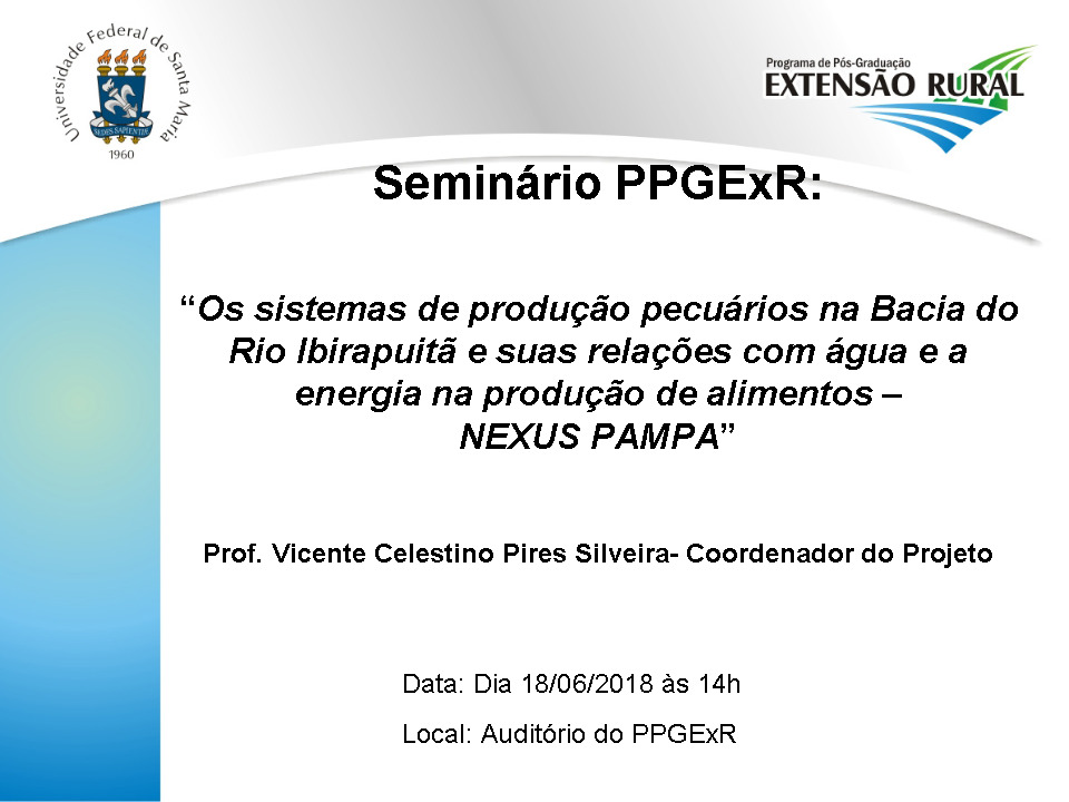 Convidamos a todos para o Seminário do PPGExR sobre o projeto “Os sistemas de produção pecuários na Bacia do Rio Ibirapuitã e suas relações com água e a energia na produção de alimentos – NEXUS PAMPA, a ser ministrado pelo Prof.Vicente Celestino Pires Silveira, que ocorrerá no dia 18/06/2018, às 14h, no Auditório do PPGExR. Para maiores detalhes, clique aquiMais informações podem ser obtidas no site do Nexus Pampa.