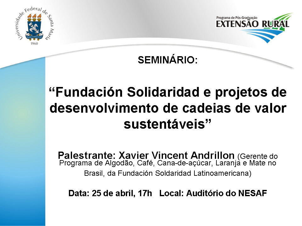 Convidamos a todos para o seminário sobre o tema “Fundación Solidaridad e projetos de desenvolvimento de cadeias de valor sustentáveis”, a ser ministrado pelo Gerente do Programa de Algodão, Café, Cana-de-açúcar, Laranja e Mate no Brasil, da Fundación Soldaridad Latinoamericana, Xavier Vincent Andrillon, que será realizado no dia 25/04/2019, às 17h, no Auditório do NESAF. Para maiores detalhes, clique aqui.