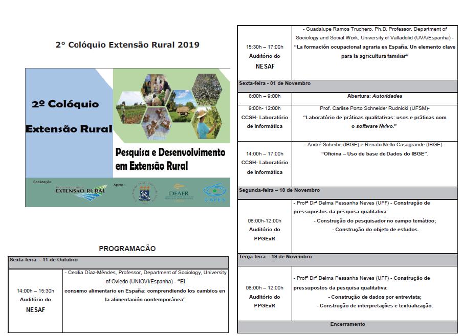 - O 2º “Colóquio Extensão Rural – Pesquisa e Desenvolvimento em Extensão Rural” dá sequência a uma nova experiência no âmbito do Programa de Pós-Graduação em Extensão Rural da Universidade Federal de Santa Maria que começou em 2018, quando realizou-se o “1º Colóquio Extensão Rural e Desenvolvimento: Perspectivas sobre o rural brasileiro”. Constitui-se como um espaço para o diálogo e trocas de conhecimento que enriquecem o ambiente de comunidade científica do nosso programa. Trata-se de um processo de debate entre pesquisadores(as) no intuito de colaborar para a produção de conhecimento científico.