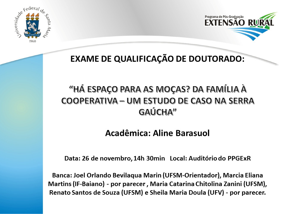 EXAME DE QUALIFICAÇÃO DE DOUTORADO – “HÁ ESPAÇO PARA AS MOÇAS? DA FAMÍLIA À COOPERATIVA – UM ESTUDO DE CASO NA SERRA GAÚCHA” Acadêmica: Aline Barasuol