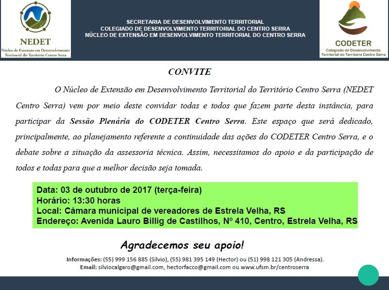 O Núcleo de Extensão em Desenvolvimento Territorial do Território Centro Serra (Nedet Centro Serra) realiza Sessão Plenária do Colegiado de Desenvolvimento Territorial (Codeter) dia 03 de Outubro de 2017 (Terça-feira), ás 13:30 horas Câmara municipal de vereadores de Estrela Velha, RS.