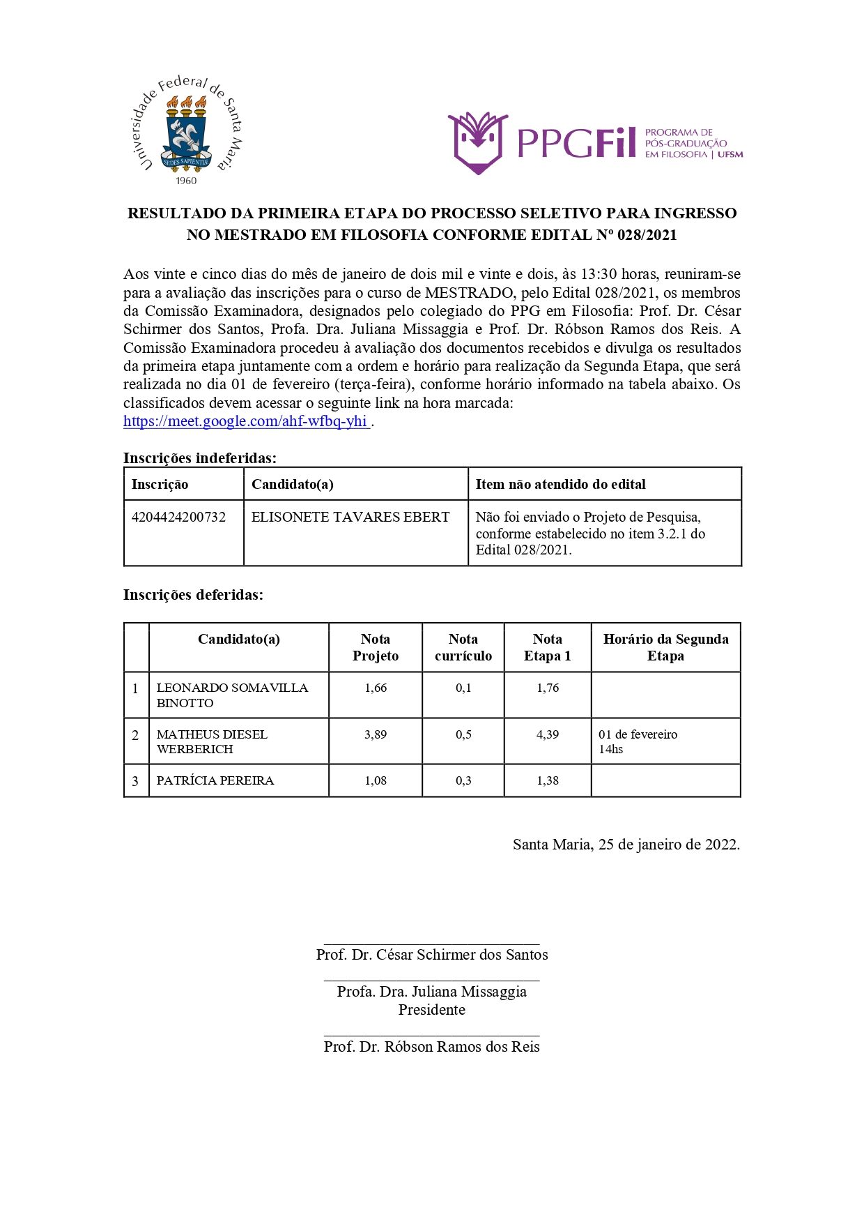 Resultado da Etapa 1 do Processo Seletivo de Mestrado e Doutorado em Filosofia | Edital 028/2021