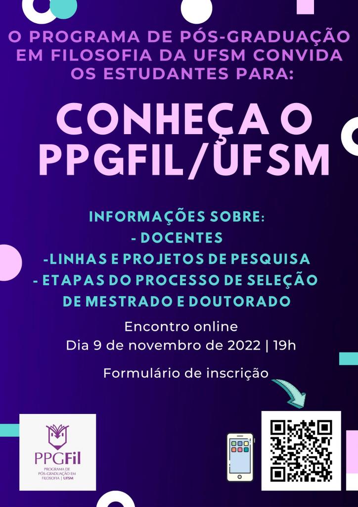 O encontro terá como objetivo realizar a divulgação do Programa de Pós-Graduação (PPG) em Filosofia para estudantes interessados em ingressar no próximo edital de seleção de mestrado e doutorado da UFSM, com entrada no primeiro semestre de 2023.