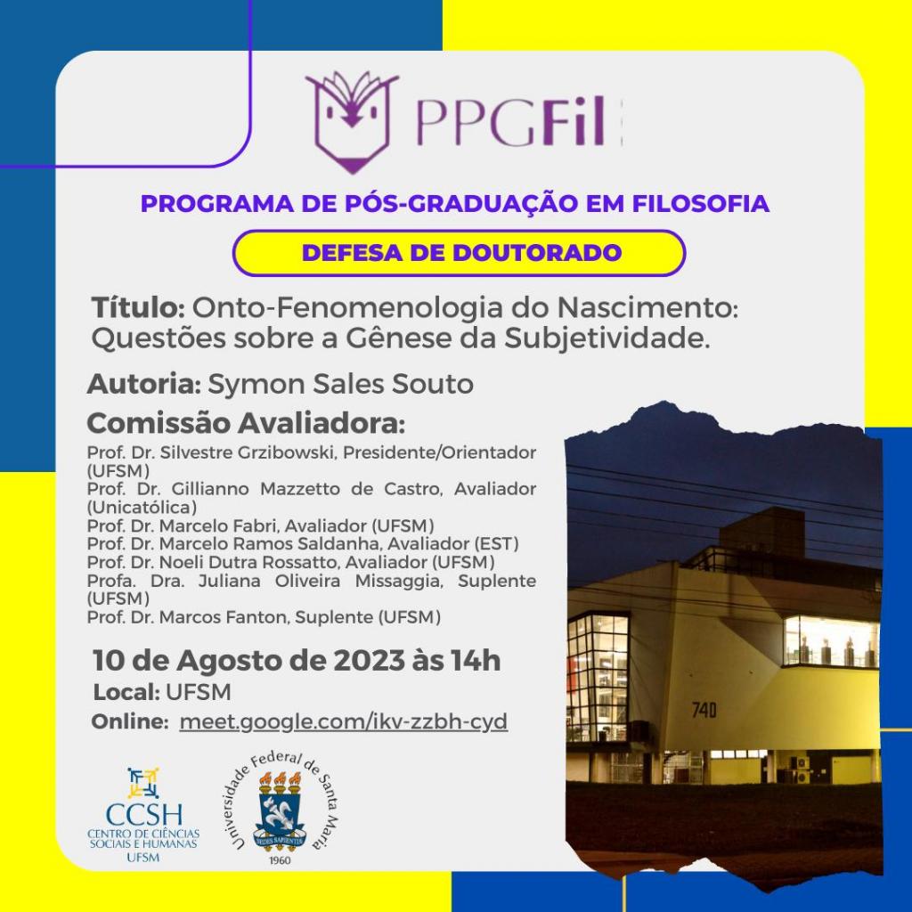 O Programa de Pós-Graduação em Filosofia divulga a banca de defesa de doutorado do aluno Symon Sales Souto, com o título “Onto-Fenomenologia do Nascimento: Questões sobre a Gênese da Subjetividade” que ocorrerá no dia 10 de agosto, às 14 horas, no local UFSM. (Link para acesso à videoconferência: meet.google.com/ikv-zzbh-cyd)