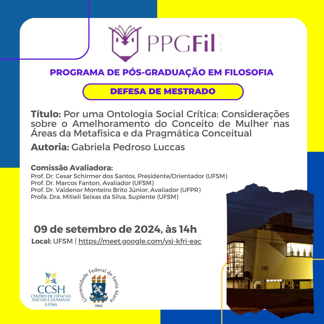 O Programa de Pós-Graduação em Filosofia divulga a banca de defesa de mestrado da aluna Gabriela Pedroso Luccas, com o título “Por uma Ontologia Social Crítica: Considerações sobre o Amelhoramento do Conceito de Mulher nas Áreas da Metafísica e da Pragmática Conceitual”, que ocorrerá no dia 09 de setembro de 2024, às 14 horas.