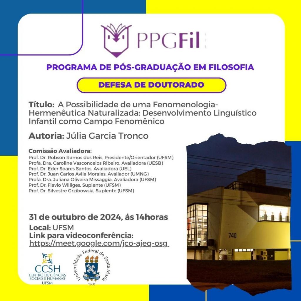 O Programa de Pós-Graduação em Filosofia divulga a banca de defesa de doutorado da aluna Júlia Garcia Tronco, com o título “A Possibilidade de uma Fenomenologia-Hermenêutica Naturalizada: Desenvolvimento Linguístico Infantil como Campo Fenomênico”, que ocorrerá no dia 31 de outubro de 2024, às 14 horas.