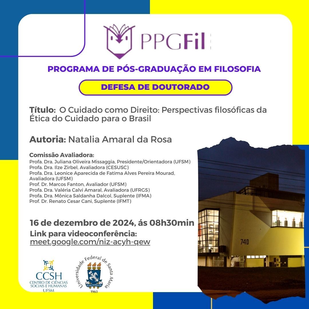 O Programa de Pós-Graduação em Filosofia divulga a banca de defesa de doutorado da aluna Natalia Amaral da Rosa, com o título “O Cuidado como Direito: Perspectivas filosóficas da Ética do Cuidado para o Brasil”, que ocorrerá no dia 16 de dezembro de 2024, às 13h30min.