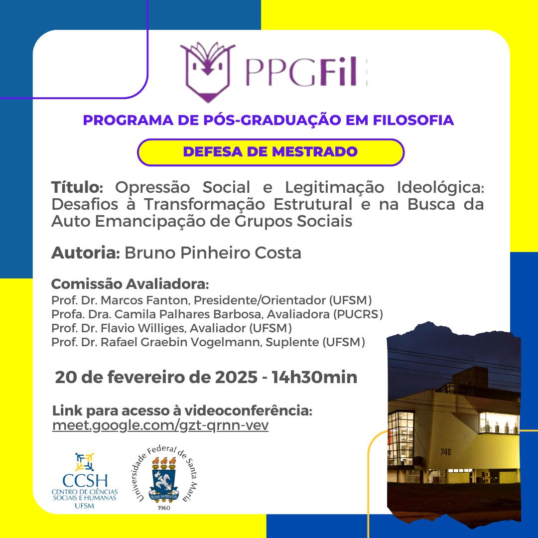 O Programa de Pós-Graduação em Filosofia divulga a banca de defesa de mestrado do aluno Bruno Pinheiro Costa, com o título “Opressão Social e Legitimação Ideológica: Desafios à Transformação Estrutural e na Busca da Auto Emancipação de Grupos Sociais”, que ocorrerá no dia 20 de fevereiro de 2025, às 14 horas e 30 minutos.