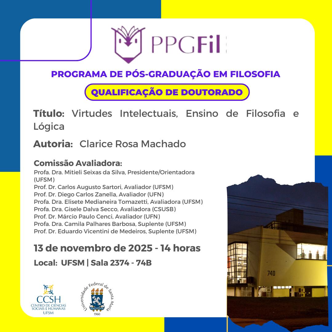 O Programa de Pós-Graduação em Filosofia divulga a banca de Qualificação de doutorado da aluna Clarice Rosa Machado, com o título “Virtudes Intelectuais, Ensino de Filosofia e Lógica” que ocorrerá no dia 13 de novembro de 2025 às 14 horas na UFSM | Sala 2374 – 74B.
