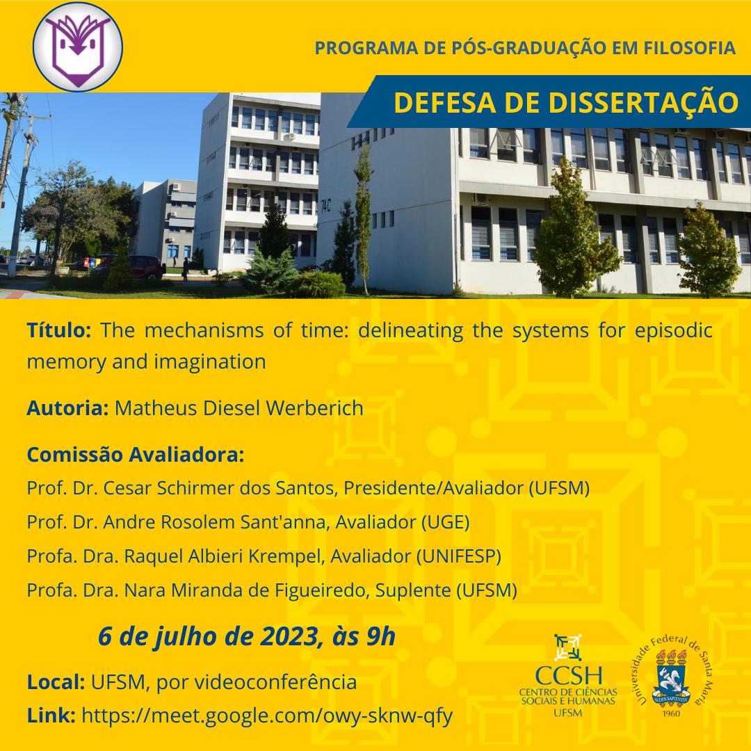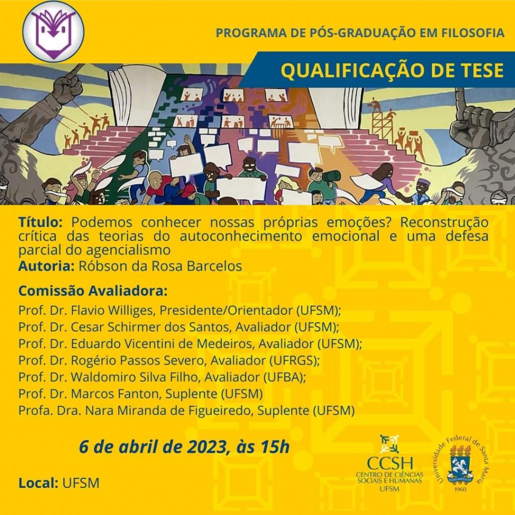 Defesa de doutorado – Eduardo Adirbal RosaO Programa de Pós-Graduação em Filosofia divulga a banca de defesa de doutorado do aluno Eduardo Adirbal Rosa, com o título “Sobre Fenomenologia da Afetividade: [...]