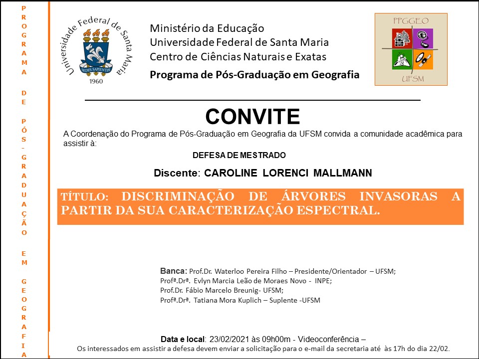 O PPGGEO convida a comunidade acadêmica para assistir a banca de defesa de dissertação de mestrado de Caroline Lorenci