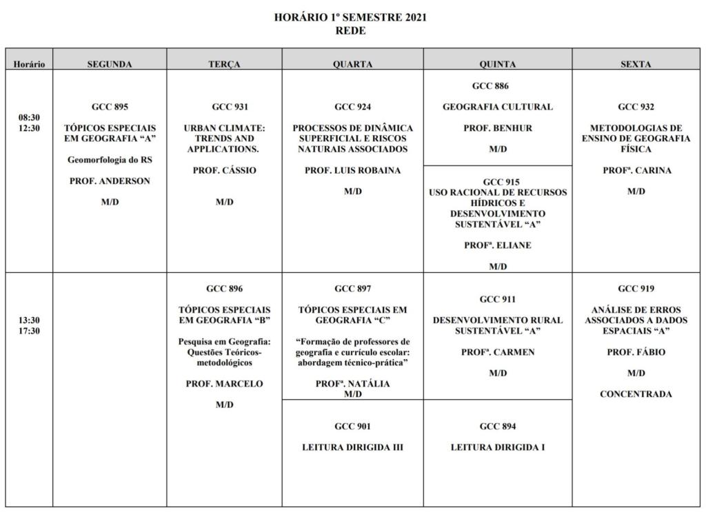 Horário e ementas de disciplinas para o 1º semestre de 2021 – PPGGEO (Formato REDE)