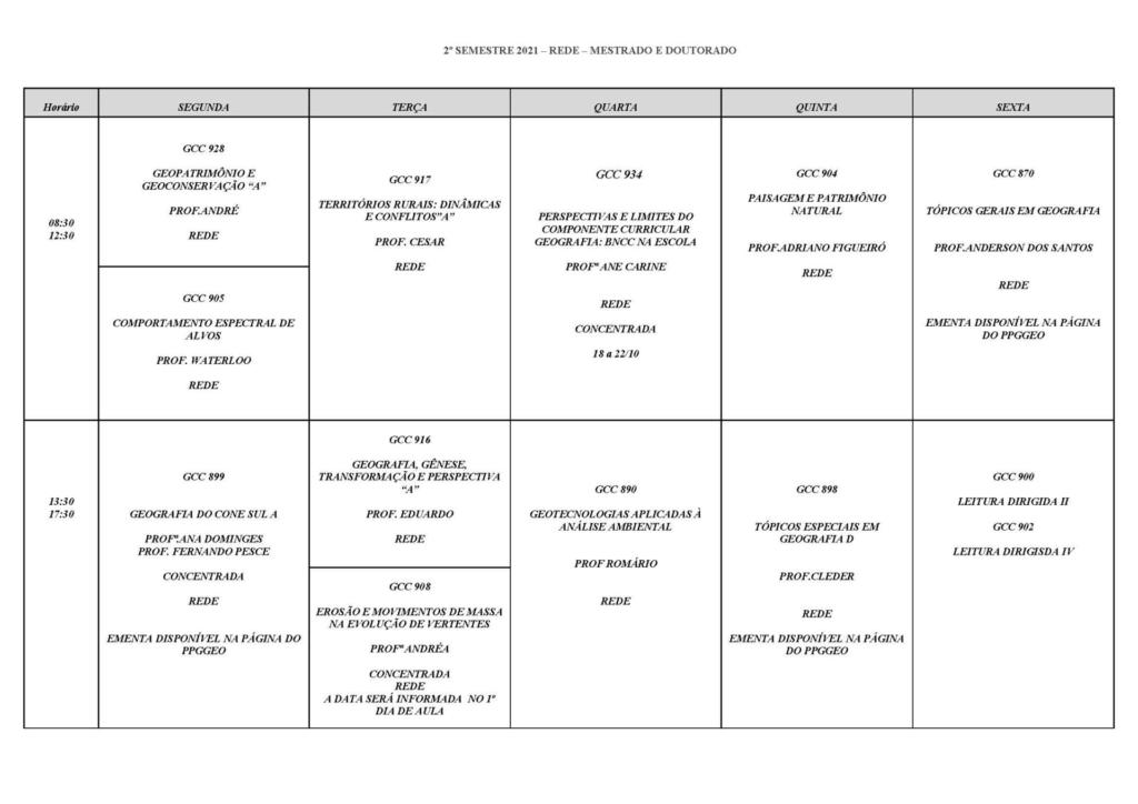 Horários das disciplinas para o 2º semestre de 2021 – PPGGEO (Formato REDE) – Atualizado