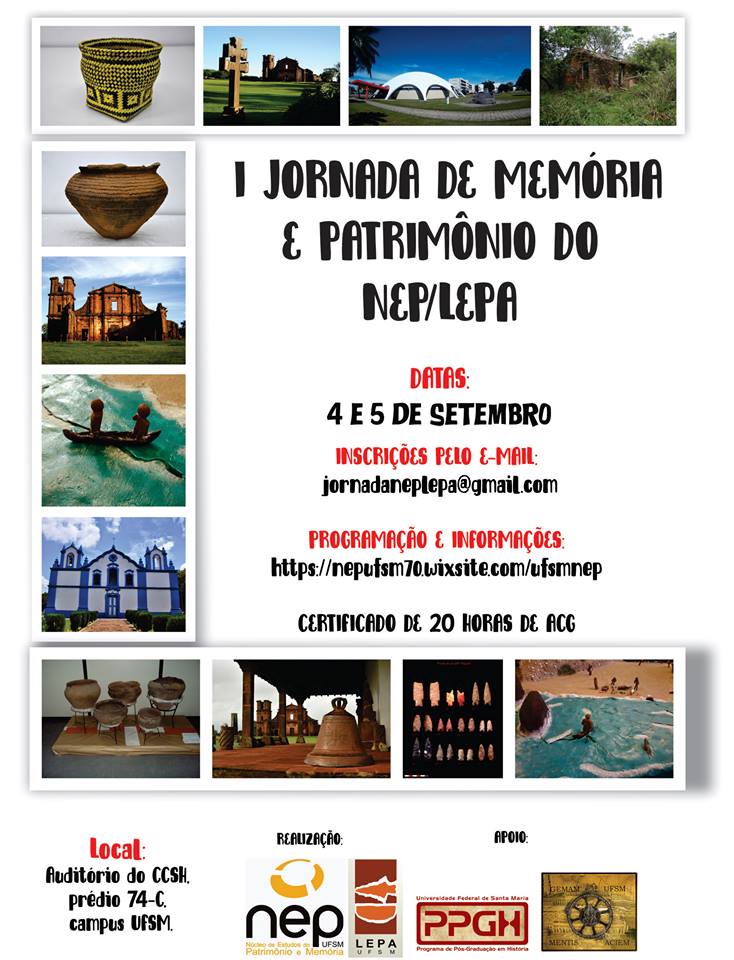 O Núcleo de Estudos do Patrimônio e Memória (NEP) e o Laboratório de Estudos e Pesquisas Arqueológicas (LEPA), os dois pertencentes ao Departamento de História da Universidade Federal de Santa Maria e sob a orientação do Professor Dr. André Luis Ramos Soares, convidam o público em geral para a I JORNADA DE MEMÓRIA E PATRIMÔNIO DO NEP/LEPA, que ocorrerá nos dias 04 e 05 de setembro de 2017, na Universidade Federal de Santa Maria (Santa Maria, RS, Brasil).