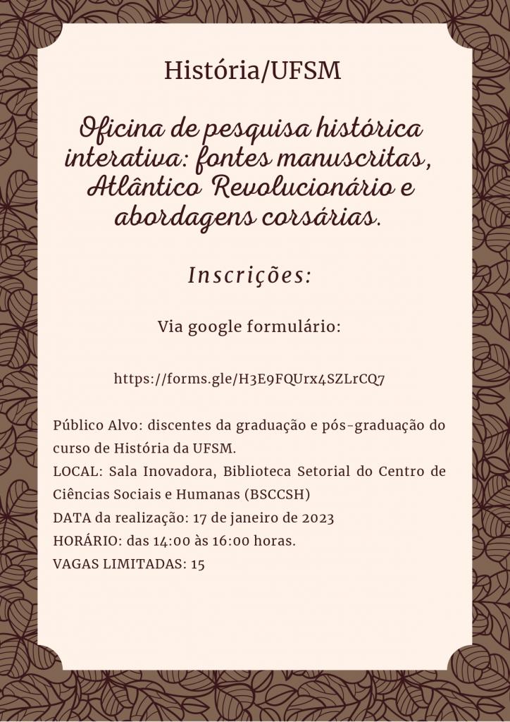 A Coordenação do Programa de Pós-Graduação em História divulga a Oficina pesquisa histórica interativa: fontes manuscritas, Atlântico Revolucionário e abordagens corsárias, que será ministrada pela Professora Quelen Lopes, pós-doutoranda pelo PPG em História, na Sala Inovadora da Biblioteca do CCSH.