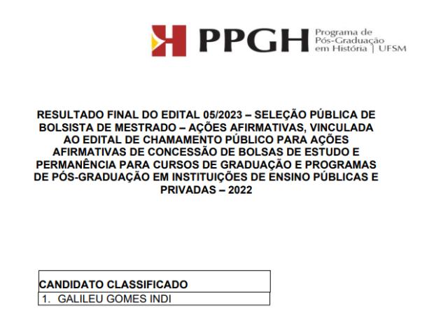 O PPGH informa que foi publicado o resultado do processo seletivo de bolsista de mestrado, vinculado ao edital de chamamento público para ações afirmativas de concessão de bolsas de estudo e permanência para cursos de graduação e programas de pós-graduação em instituições de ensino públicas e privadas – 2022. O resultado pode ser conferido aqui.