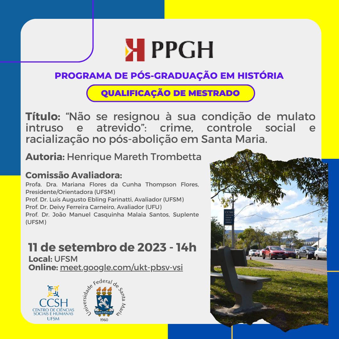 O Programa de Pós-Graduação em História divulga a banca de qualificação de mestrado do aluno Henrique Mareth Trombetta, com o título “‘Não se resignou à sua condição de mulato intruso e atrevido’: crime, controle social e racialização no pós-abolição em Santa Maria”, que ocorrerá no dia 11 de setembro, às 14 horas, na UFSM. Link para acesso à videoconferência: meet.google.com/ukt-pbsv-vsi.