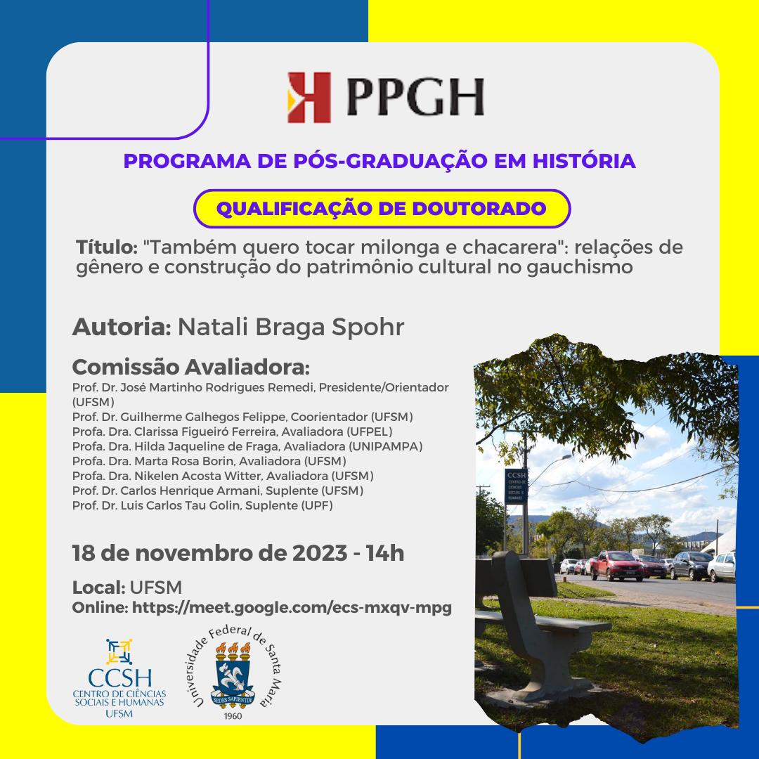 O Programa de Pós-Graduação em História divulga a banca de defesa de doutorado da aluna Natali Braga Spohr, com o título ““Também quero tocar milonga e chacarera”: relações de gênero e construção do patrimônio cultural no gauchismo”, que ocorrerá no dia 18 de outubro, às 14 horas.