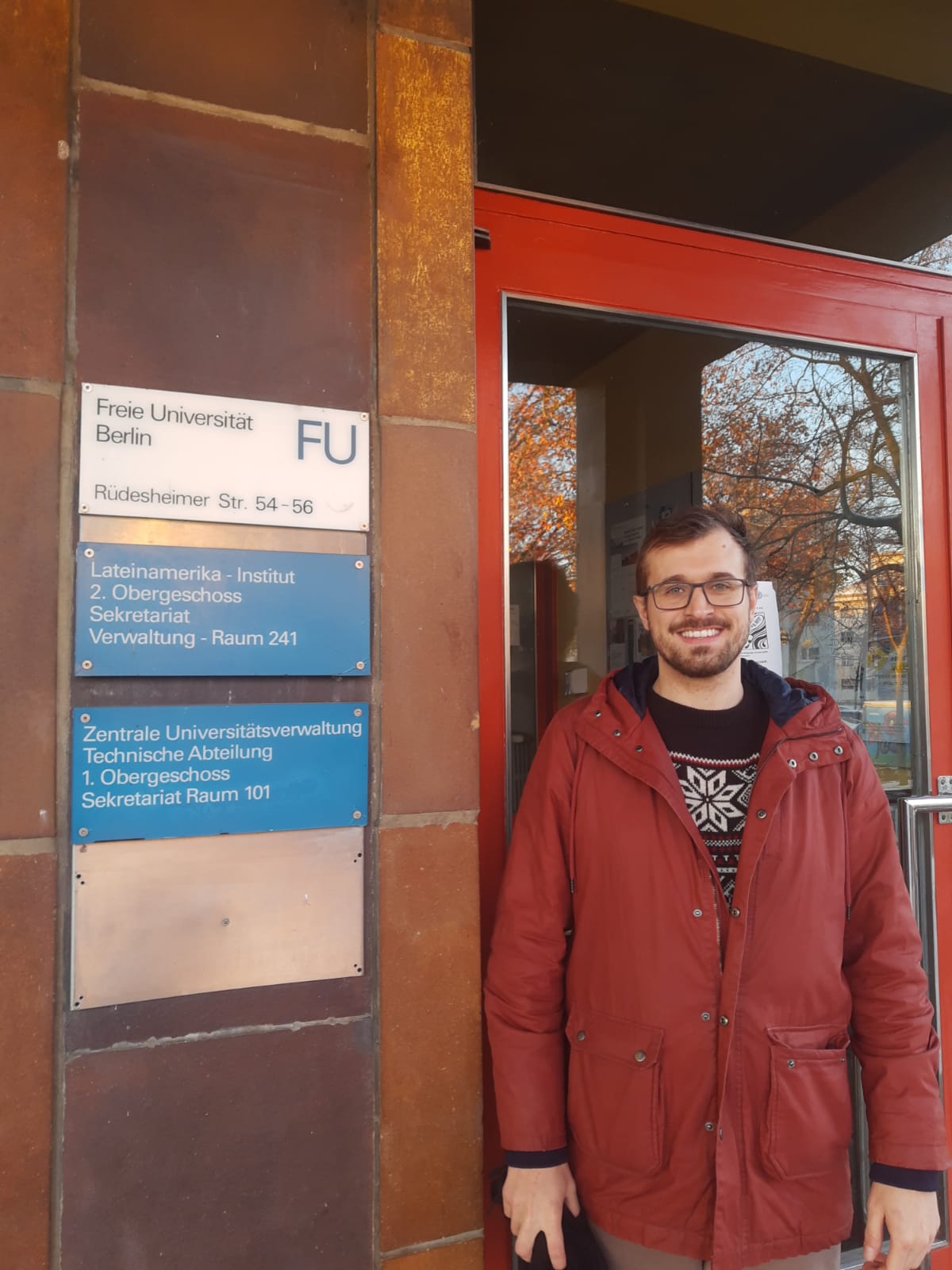 O Doutorando do Programa de Pós-Graduação em História da Universidade Federal de Santa Maria, João Vitor Sausen, está realizando um período de Doutorado Sanduíche, com Bolsa PDSE da CAPES/Brasil, na Universidade Livre de Berlim, Alemanha, como pesquisador visitante no Lateinamerika Institut (Instituto Latinoamericano), sob orientação do Prof. Dr. Stefan Rinke. (https://www.lai.fu-berlin.de/disziplinen/geschichte/Gaeste/Aktuelle-Aufenthalte/index.html). As atividades de pesquisa iniciaram no começo do mês de outubro de 2023 e serão desenvolvidas até o final de março de 2024. Durante este período, além das reuniões de orientação na Universidade Livre de Berlim e online com a orientadora do PPGH/Brasil, Profª. Drª. Maria Medianeira Padoin, estão sendo realizadas pesquisas em arquivos e bibliotecas, especialmente no Ibero-Amerikanisches Institut (Instituto Íbero-Americano), que abriga o segundo maior acervo de temáticas relativas a Ibero-Americana no mundo. Além disso, João também participa das atividades do Forschungskolloquium zur Geschichte Lateinamerikas (Colóquio de História Latinoamericana), conduzido pelo Prof. Dr. Stefan Rinke, e que envolve a participação de doutorandos, pós-doutorandos e pesquisadores convidados, tanto da Europa como da América.