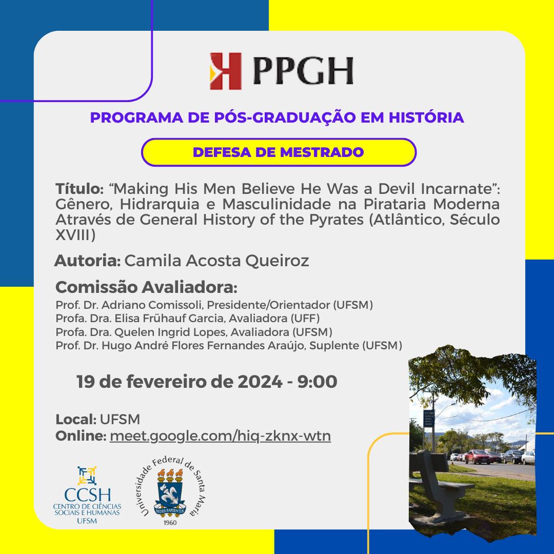 O Programa de Pós-Graduação em História divulga a banca de defesa de mestrado da aluna Camila Acosta Queiroz, com o título “‘Making His Men Believe He Was a Devil Incarnate’: Gênero, Hidrarquia e Masculinidade na Pirataria Moderna Através de General History of the Pyrates (Atlântico, Século XVIII)“, que ocorrerá no dia 19 de fevereiro de 2024, às 9 horas. Link para acesso à videoconferência: https://meet.google.com/hiq-zknx-wtn.