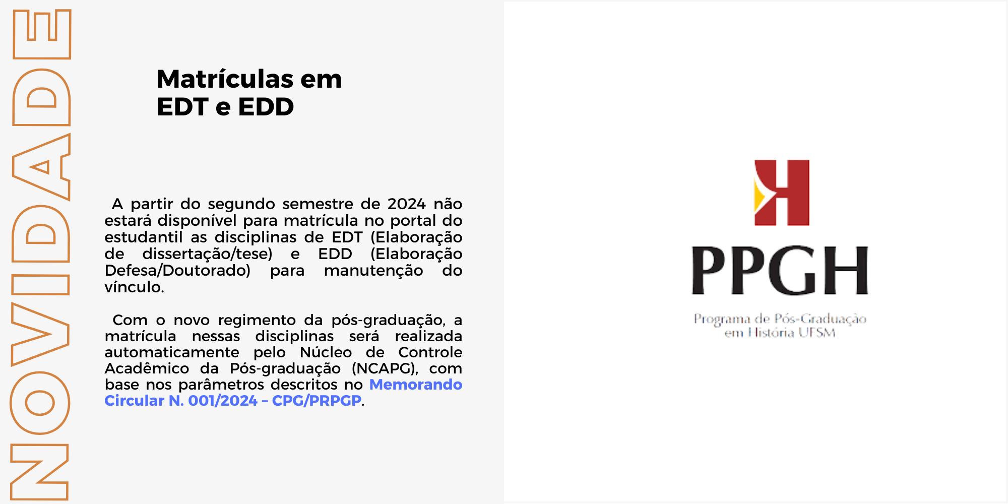 Informamos a todos que neste segundo semestre de 2024 não estará disponível para matrícula no portal do estudantil as disciplinas de EDT (Elaboração de dissertação/tese) e EDD (Elaboração Defesa/Doutorado) para manutenção do vínculo.