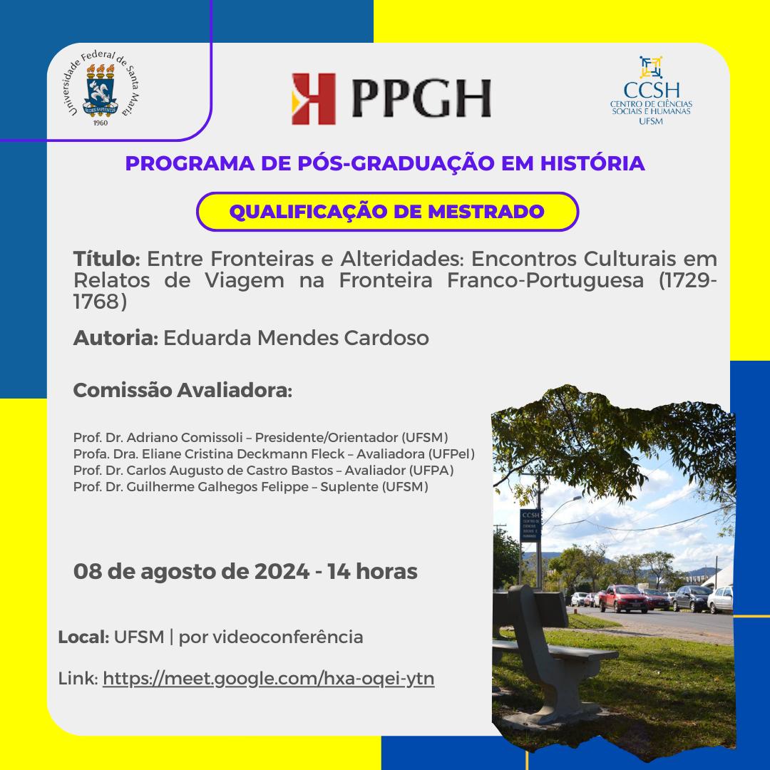 O Programa de Pós-Graduação em História divulga a banca de qualificação de mestrado da aluna  Eduarda Mendes Cardoso, com o título “Entre Fronteiras e Alteridades: Encontros Culturais em Relatos de Viagem na Fronteira Franco-Portuguesa (1729-1768)”, que ocorrerá no dia 08 de agosto de 2024, às 14 horas.