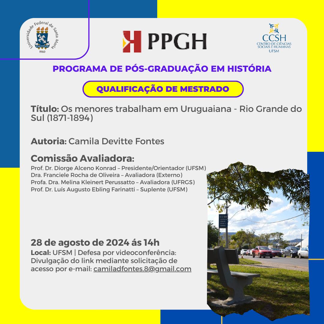 O Programa de Pós-Graduação em História divulga a banca de qualificação de mestrado da aluna Camila Devitte Fontes, com o título “Os menores trabalham em Uruguaiana – Rio Grande do Sul (1871-1894)”, que ocorrerá no dia 28 de agosto de 2024, às 14h.