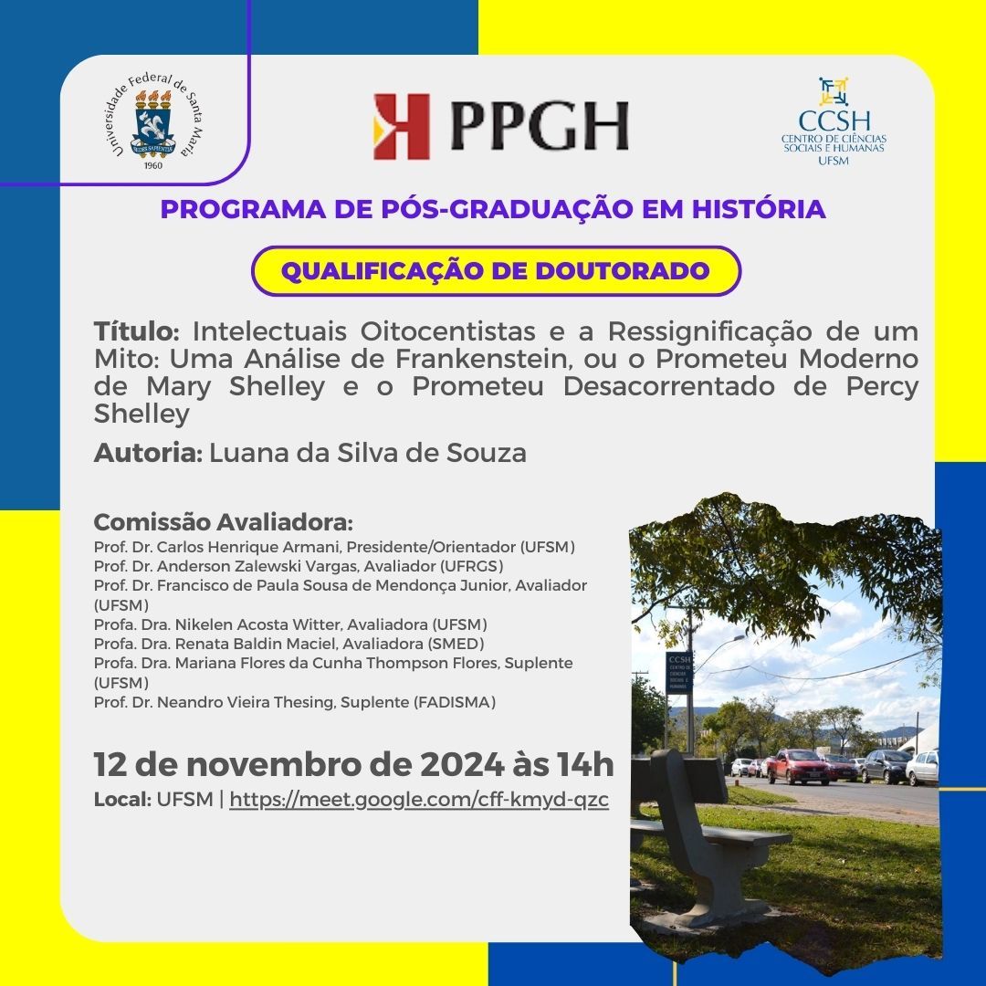 O Programa de Pós-Graduação em História divulga a banca de qualificação de doutorado da aluna Luana da Silva de Souza, com o título “Intelectuais Oitocentistas e a Ressignificação de um Mito: Uma Análise de Frankenstein, ou o Prometeu Moderno de Mary Shelley e o Prometeu Desacorrentado de Percy Shelley”, que ocorrerá no dia 12 de novembro, às 14 horas.