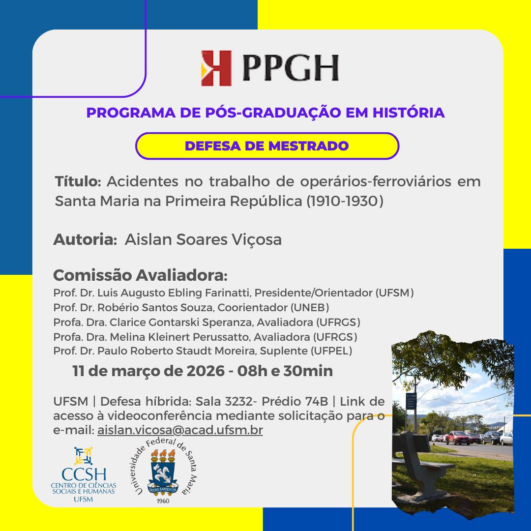 O Programa de Pós-Graduação em História divulga a banca de defesa de mestrado do aluno Aislan Soares Viçosa, com o título “Acidentes no trabalho de operários-ferroviários em Santa Maria na Primeira República (1910-1930)”, que ocorrerá no dia 11 de março de 2026, às  08 horas. e 30min.