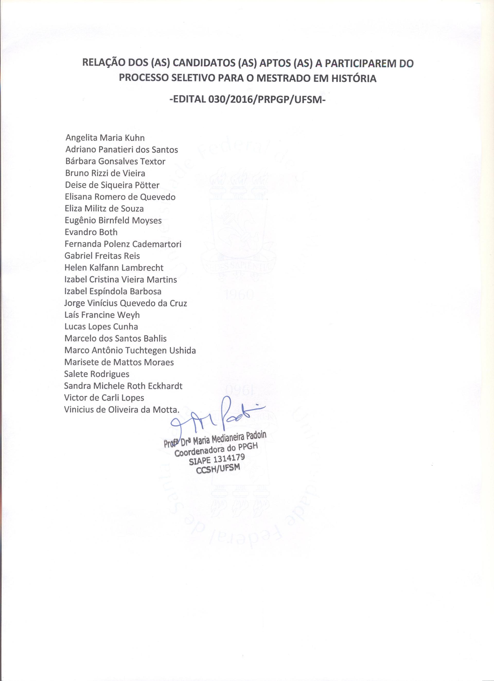 08/11/2016 – Relação dos (as) candidatos (as) aptos (as) a participarem do processo seletivo para o Mestrado em História – Edital 030/2016/PRPGP/UFSM