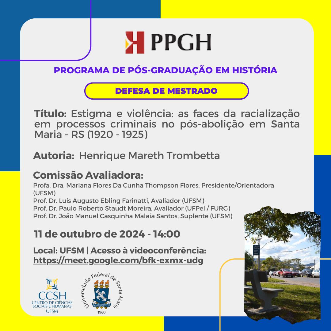 O Programa de Pós-Graduação em História divulga a banca de defesa de mestrado do aluno Henrique Mareth Trombetta, com o título “Estigma e violência: as faces da racialização em processos criminais no pós-abolição em Santa Maria – RS (1920 – 1925)”, que ocorrerá no dia 11 de outubro, às 14 horas.