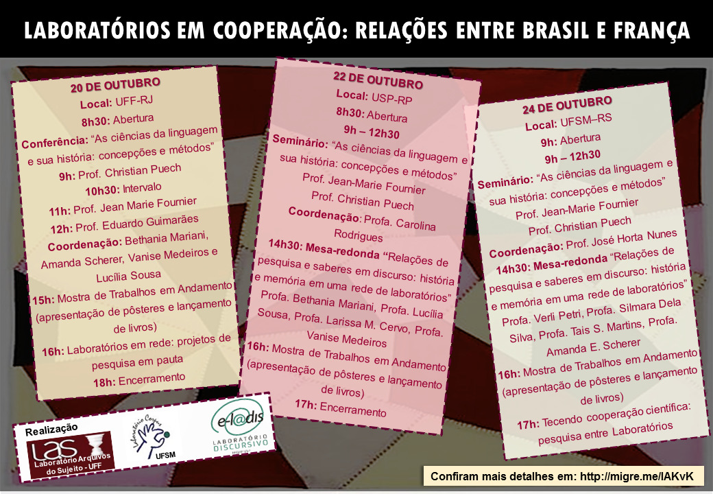 O evento Laboratórios em Cooperação: Relações entre Brasil e França é o segundo seminário a se realizar a partir de um projeto integrado intitulado Mobilité Internationale entre Laboratoires, reunindo quatro laboratórios associados (Laboratoire Histoire des Théories Linguistiques(Université Sorbonne Nouvelle – Paris 3), Laboratório de Fontes de Estudos da Linguagem – Corpus (UFSM), Laboratório Arquivos do Sujeito – LAS (UFF) Laboratório Discursivo, sujeito e sentidos em movimento – EL@DIS (USP-RP). O projeto Mobilité Internationale entre Laboratoires, aprovado em fevereiro de 2014, trata das relações temáticas de pesquisa pela influência dos estudos franceses na constituição disciplinar brasileira e, durante dois anos, serão realizadas reuniões de trabalho, estágio pós-doutoral, estágio de doutorandos e mestrandos, além de jornadas de pesquisa on-line e presencial nas quatro universidades.