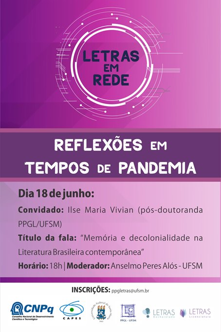 No dia 18 de junho de 2020, às 18h acontecerá o terceiro evento da série “Reflexões em tempos de pandemia”. O evento contará com a participação da Prof.ª Dr.ª Ilse Maria Vivian  (PNPD/PPGL -UFSM) e do Prof. Dr. Anselmo Peres Alós (PPGL/UFSM).
