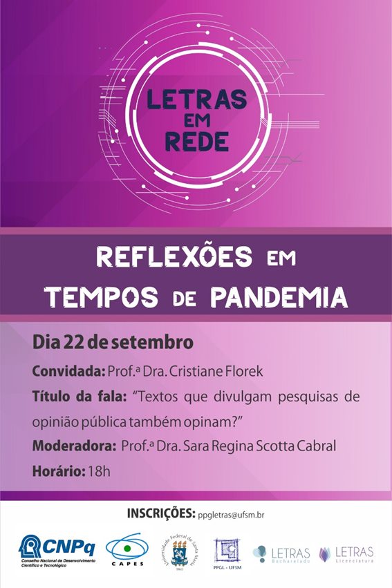 No dia 22 de stembro de 2020, às 18h acontecerá a live “Reflexões em tempos de pandemia” com a participação da Profa. Dra. Cristiane Florek (PNPD/UFSM) e Profa. Dra. Sara Regina Scotta Cabral (PPGL/UFSM). O tema abordado será “Textos que divulgam pesquisas de opinião pública também opinam?”.