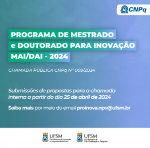 A PROINOVA e a PRPGP divulgam a oportunidade que  o Conselho Nacional de Desenvolvimento Científico e Tecnológico (CNPq) tornou pública no dia 11/04/2024, a chamada CNPq / N° 009/2024 Programa de Mestrado e Doutorado Para Inovação  – MAI/DAI. A chamada pública visa a concessão de bolsas de doutorado, mestrado, pós-doutorado empresarial e iniciação científica e industrial em projetos a serem apresentados por Instituições Científicas, Tecnológicas e de Inovação- ICTs. Mais informações no link: https://www.gov.br/cnpq/pt-br/assuntos/noticias/cnpq-em-acao/cnpq-lanca-nova-chamada-do-programa-de-mestrado-e-doutorado-para-inovacao-mai-dai-1